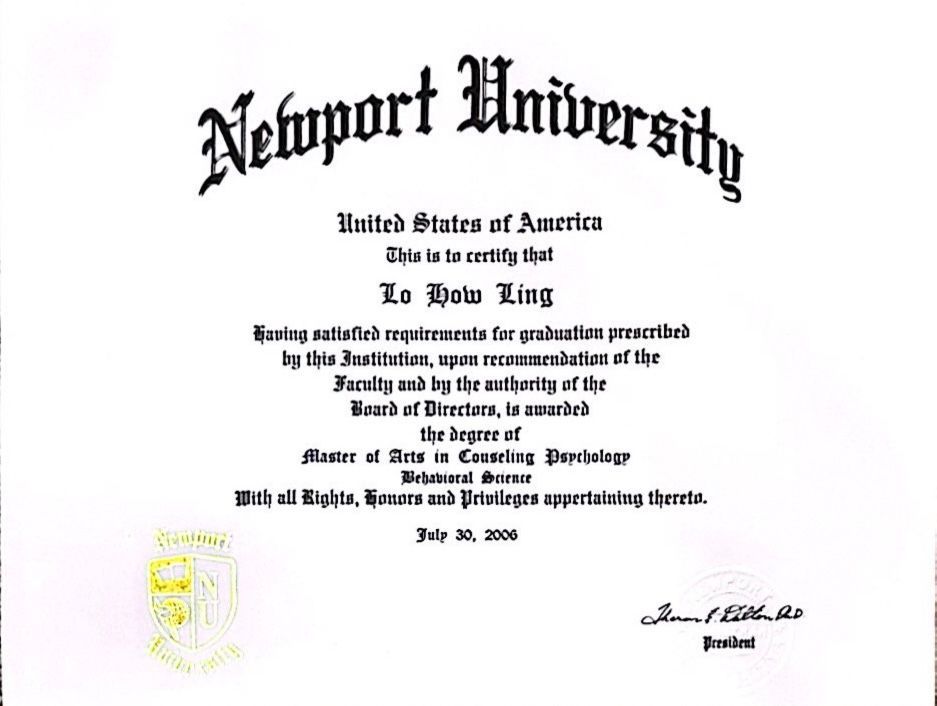 - Master of Arts in Counselling Psychology (Newport University USA)